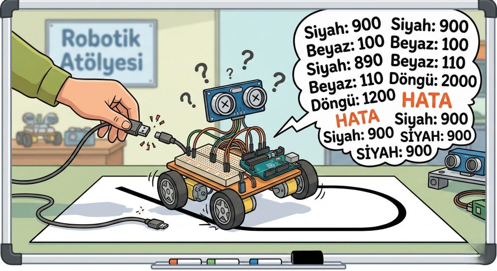 Serial.print Robotu Yoldan Çıkarır mı? Atölyede karşılaştığımız sorunlardan birine daha değinmek istiyorum. Robotu hazırladınız USB kablosuyla kodu yüklediniz